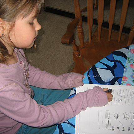Your daughter might be encouraged to use the word families from the Name Game to create 8×11 posters of word families, perhaps decorating the posters with her own illustrations of some of the words listed there, alongside the word family. [For example, cake, bake, rake, with an illustration of a cake and, in big letters, ‘-ake’ at the top of the poster.]