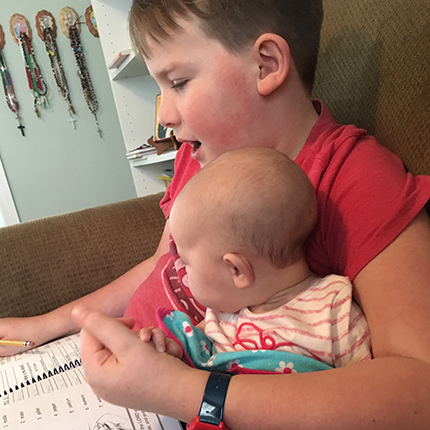 Next, a child who feels defeated can sometimes benefit by actually teaching others at a very low level. I note that you have a five-year-old; if you are beginning this child in the Little Stories for Little Folks: Catholic Phonics Readers, perhaps your daughter can become an assistant to him or her, using the phonics-based word family cards. She can then move on to the Name Game to help teach the five-year-old, meanwhile learning the same letter sounds and families herself.